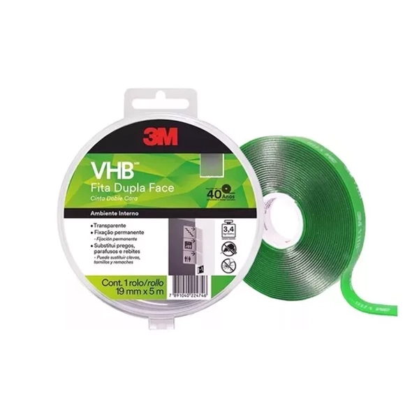 • Adhesivo y espuma acrílico • Calidad 3M • Modelo VHB 4910 • Medidas 19mm x 5m • Para amplia variedad de materiales, incluyendo metales, vidrio, plásticos, acrílicos